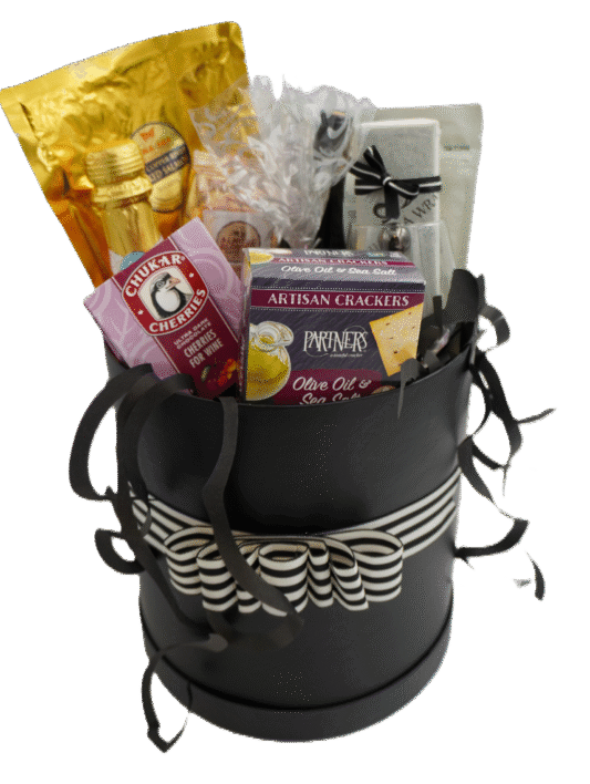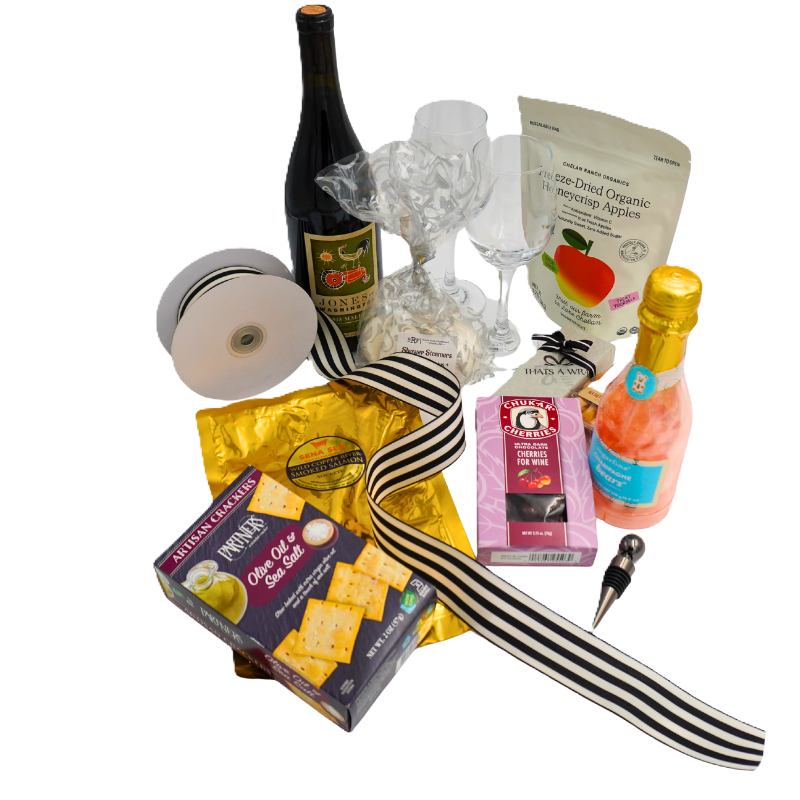 Chukar Cherries - Milk Chocolate CherriesGift basket contentsJones Malbec bottlesugarfina Champagne bottleAlmond Blossom Sea Salt Roasted CashewsSena Sea wild smoked sockeye salmon packets