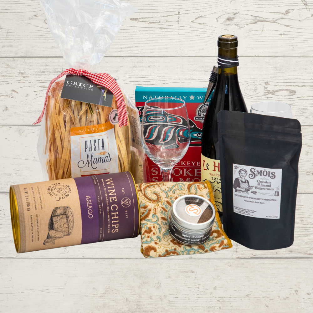 Everything needed for a cozy and delicious evening is beautifully gathered in The Complete Dinner Basket. This thoughtfully curated gift brings together appetizers, dinner, dessert, and a few elegant kitchen touches to create a memorable dining experience at home.